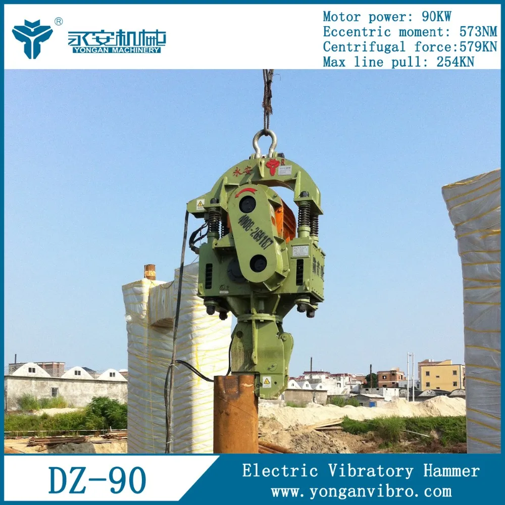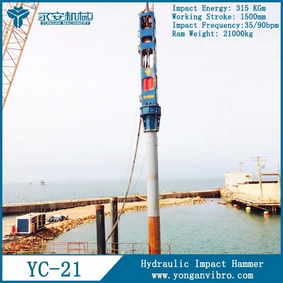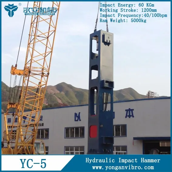 Hydraulic impact hammer YC-5 is widely applicable for most types of piling and foundation works. Various pipe material, size and shape such as concrete pile, steel sheet pile, H beam, casing pile and shapes like round, square, octagoanl, etc.