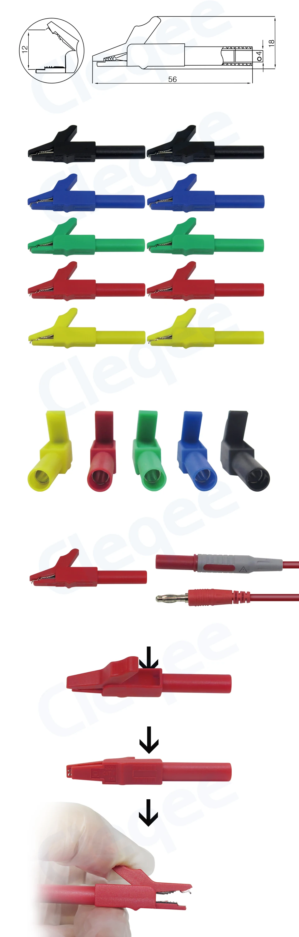 Cleqee P2007 10PCS Fully Insulated Alligator Clips to 4mm Banana Female Jack Safe Crocodile Clamp Test Accessories Adapter