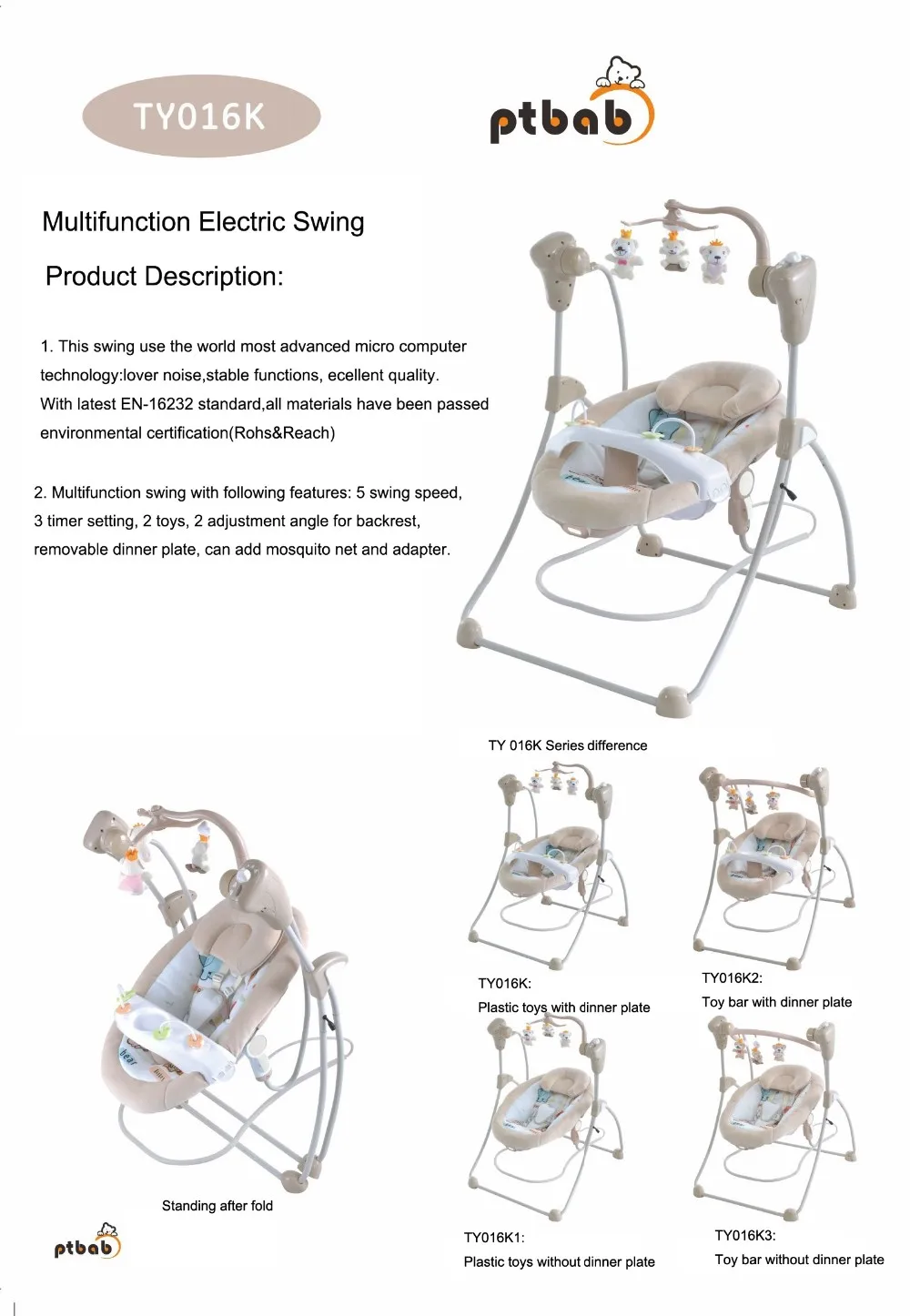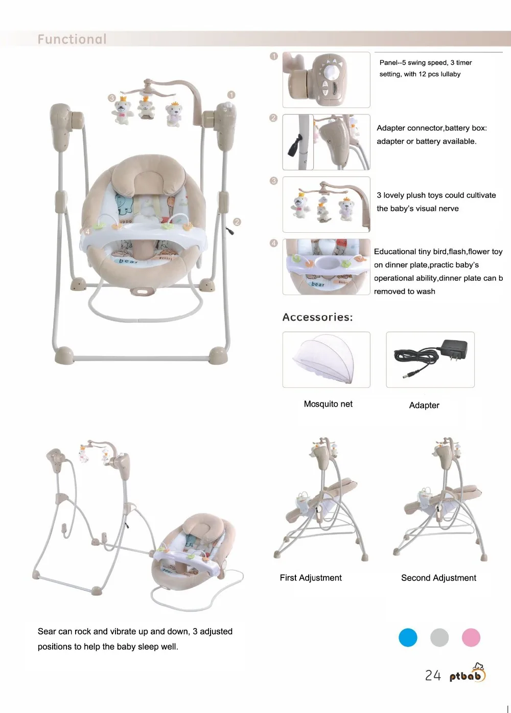 1. 5 swing peed; 3 timer setting; 2 toys;