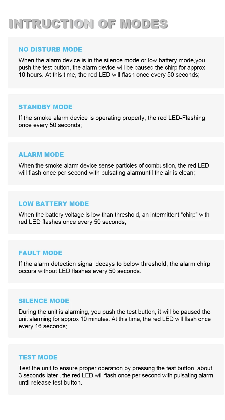 Indicator | Flash alarm indicator(red LED), Low battery signal | Special Function | Silence Function:10 minutes |