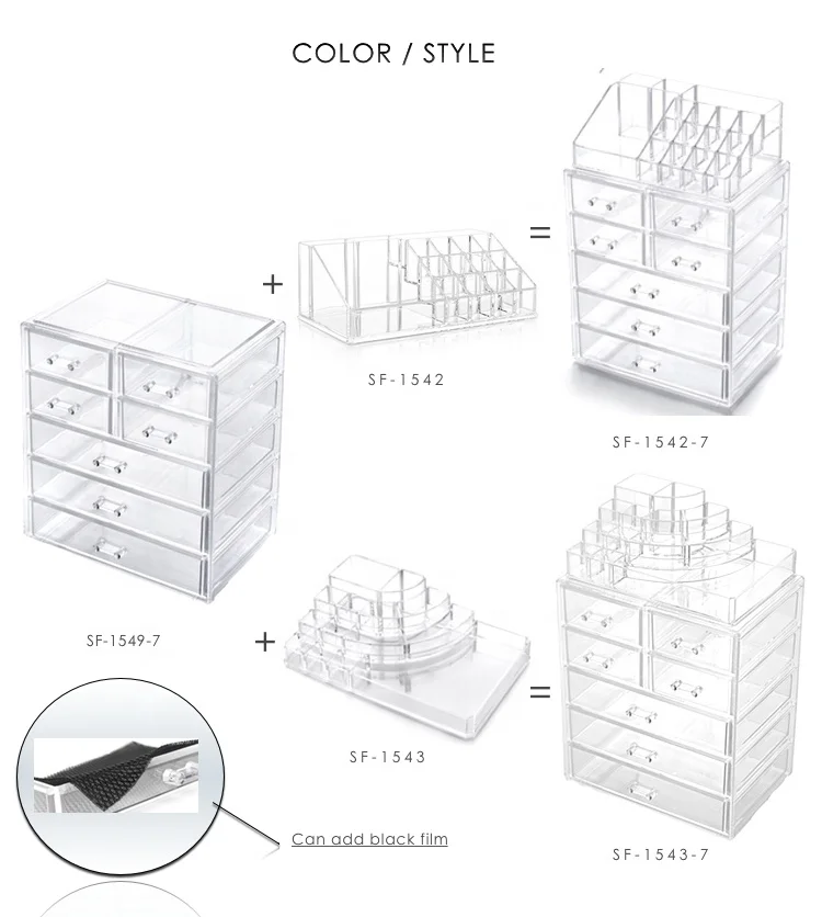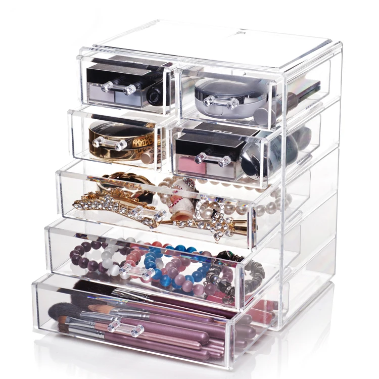 Advantages: | 1)COSMETIC & MAKEUP STORAGE CASE (3 LARGE, 4 SMALL DRAWERS, 16 SLOTS, CLEAR) 2)SLEEK & STYLISH 3)BEAUTIFULLY DISPLAY & STORE 4)FUNCTIONAL & CONVENIENT 5)DURABLE & LONG-LASTING |