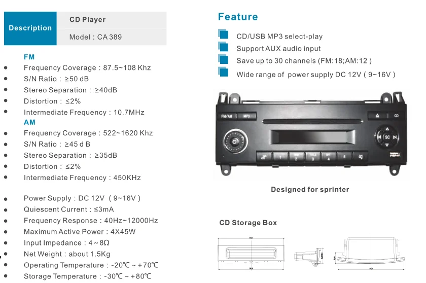 Bus Car CD player with FM AM USB for Sprinter