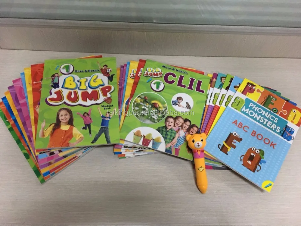 The pen equipped with different books for teaching kids character, words, sentence and so on.