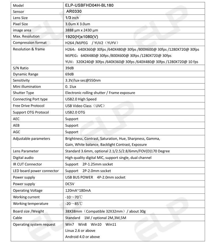 Specification of wide angle H.264 usb camera: