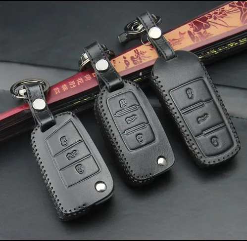 3D Black Car Remote Aritical Threading Leather Car Key Case Cover For VW Polo Golf6 CC Golf7 3 foldable buttons