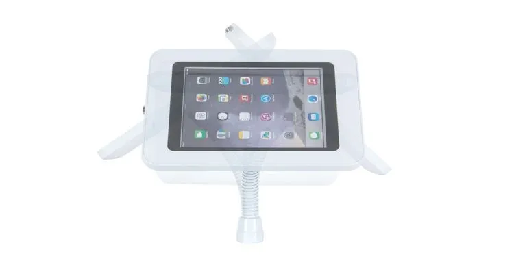 20-MTB series equipped with flexible mounting tube TUBE-FLEX allow user to adjust the view angle freely, meanwhile the charging cable hidden inside the aluminum mounting tube, then go through and connect to power supply, the cable is protected and the whole kiosk is clean looking and professional. It use MTB001 screw mounting base to mount the kiosk onto desk top and wall surface.