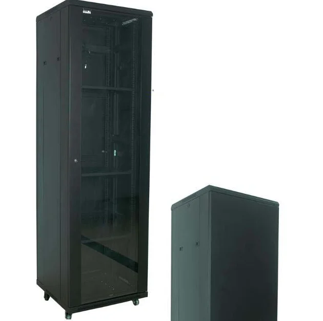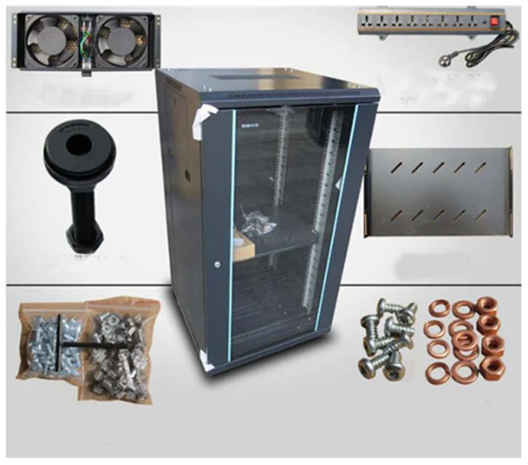 | Unassembled rack is equipped with 2 pairs of 19-inch movable vertical extrusions, one pair of side panels with quick release locking fastener, tempered glass front, door with lock, rear metal door with lock. |