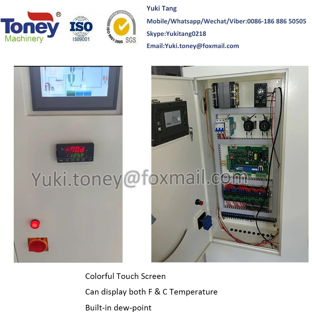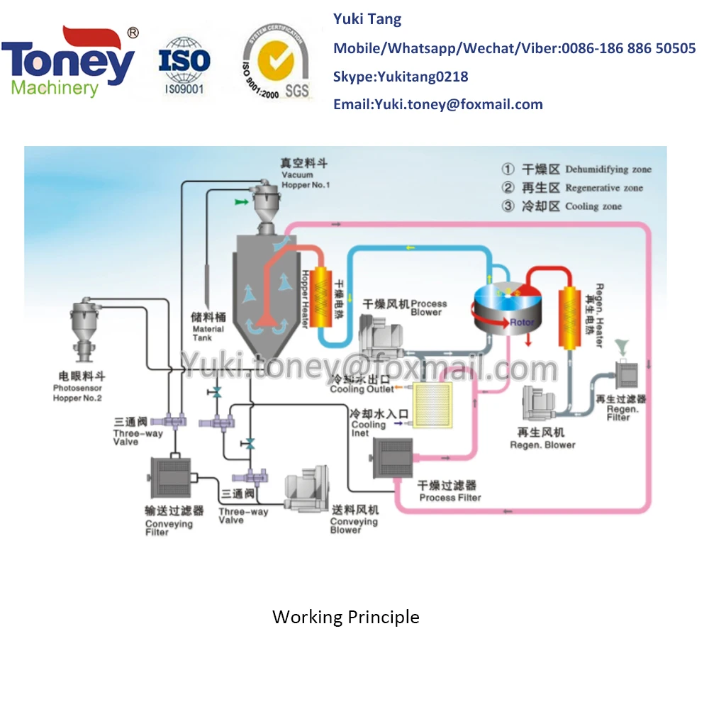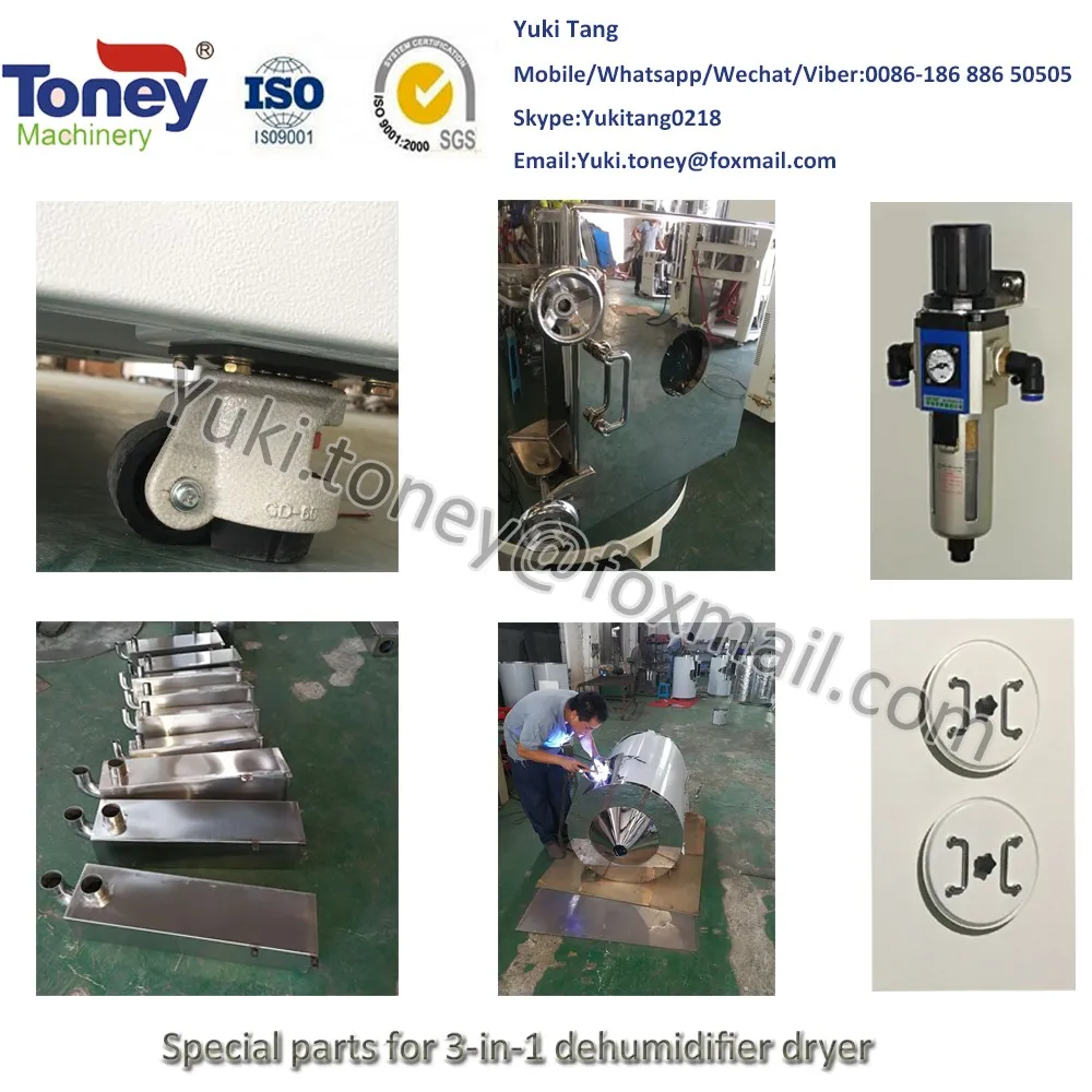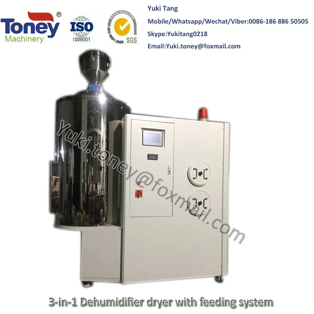 3 in 1 dehumidifying dryer energy-efficient type compact dryers simplify the design of system which reduces power consumption. It combines conventional hot air drying and two-stage conveying functions into a compact unit, It is suitable for drying engineering plastics which a certain requirement for moisture content such as ABS,PC,PE,PVC and PU, It takes advantage of heatless regenerative device and offers stable low dew-point dried air, can dry material more easily.