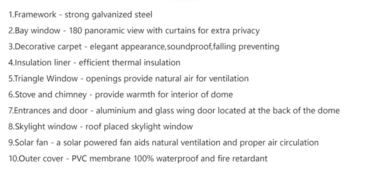Optional accessories | Glass door/ Ventilation windows/ Insulation/ Skylight/ Air conditioner/ Flooring system/ Table/ Chair/ Lamp/ Carpet etc.. | |