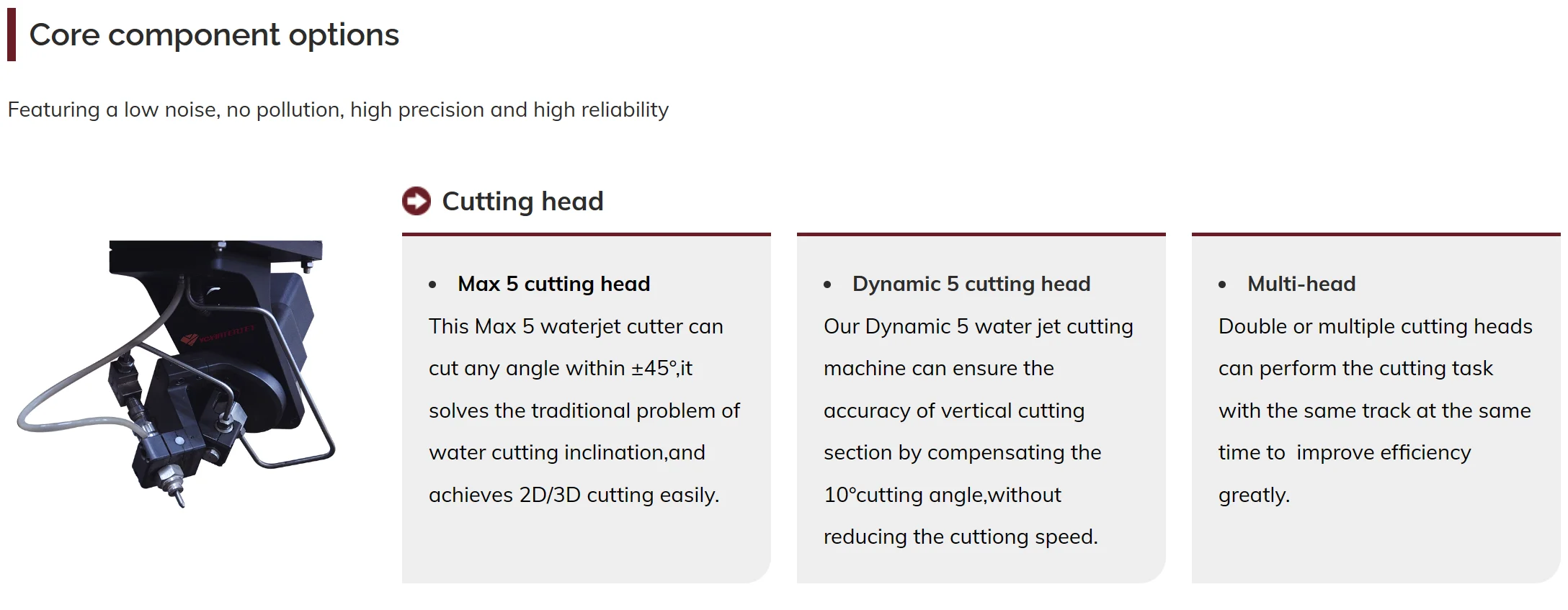 Superior precision and stability are guaranteed by the casting beam and base frame of Y-axis. Lathe bed and water tank are detachable, which are designed to reduce the pressure from water with sands and machined parts to moving parts. The base of Y-axis is overall manufacturing, It’s convenient for disassembly, transportation and assembly. X-axis and Y-axis adopt high-precision ball screw and guide linear rail.