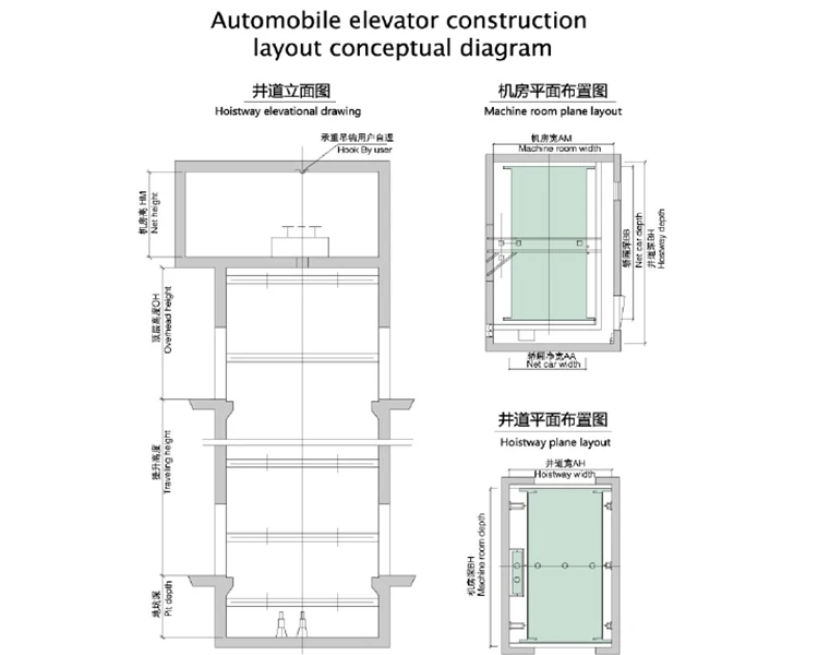 | Load KG | Speed m/s | (MM) Door opening size DW*DH | (MM) Inside Car dimension CW * CD | outside car dimension CW*CD(MM) | (MM) Hoistway Size HW*HD | Overhead height OH(mm) | Pit Depth PD(MM) | Machine room size RW*RH(MM) | Machine room height RH(MM) | Opening Method |