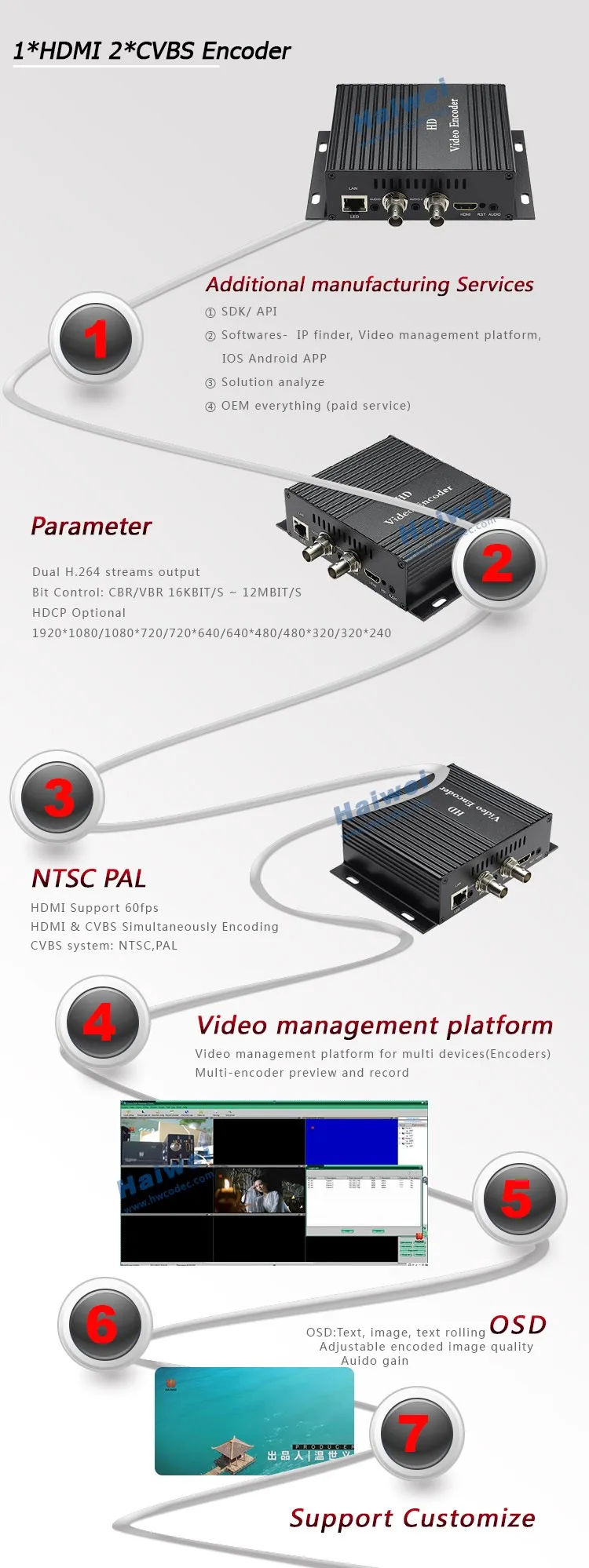 Shenzhen Haiwei Vision technology is specializes in R&D, design, manufacturing, sale and provide tech support of a series of Audio& Video hardware including HDMI/ SDI/ VGA/ CVBS/ YPBPR/ 3G/ 4G/ Wi-Fi/ 1U/ 2U/ 3U video encoder, wireless image transmission equipment.