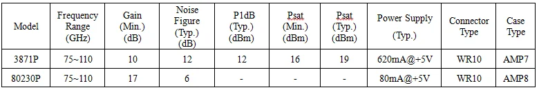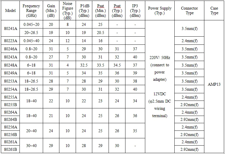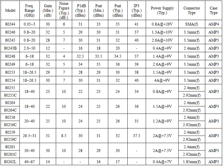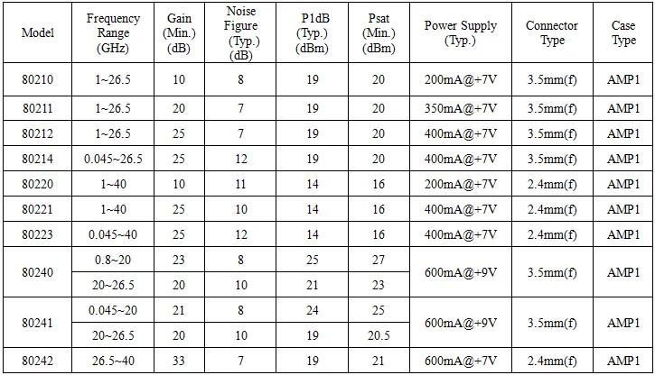 Model | Frequency Range (GHz) | Gain (Min.) (dB) | Noise Figure (Max.) (dB) | P1dB (Typ.) (dBm) | Power Supply (Typ.) | Connector Type | Case Type |