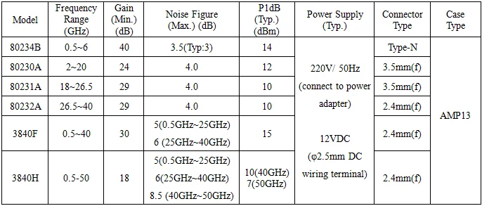 80230H | 0.5-50 | 18 | 5 (0.5GHz~25GHz) 6 (25GHz~40GHz) 8.5 (40GHz~50GHz) | 10(40GHz) 7(50GHz) | 200mA@+7V | 2.4mm(f) | AMP1 |
