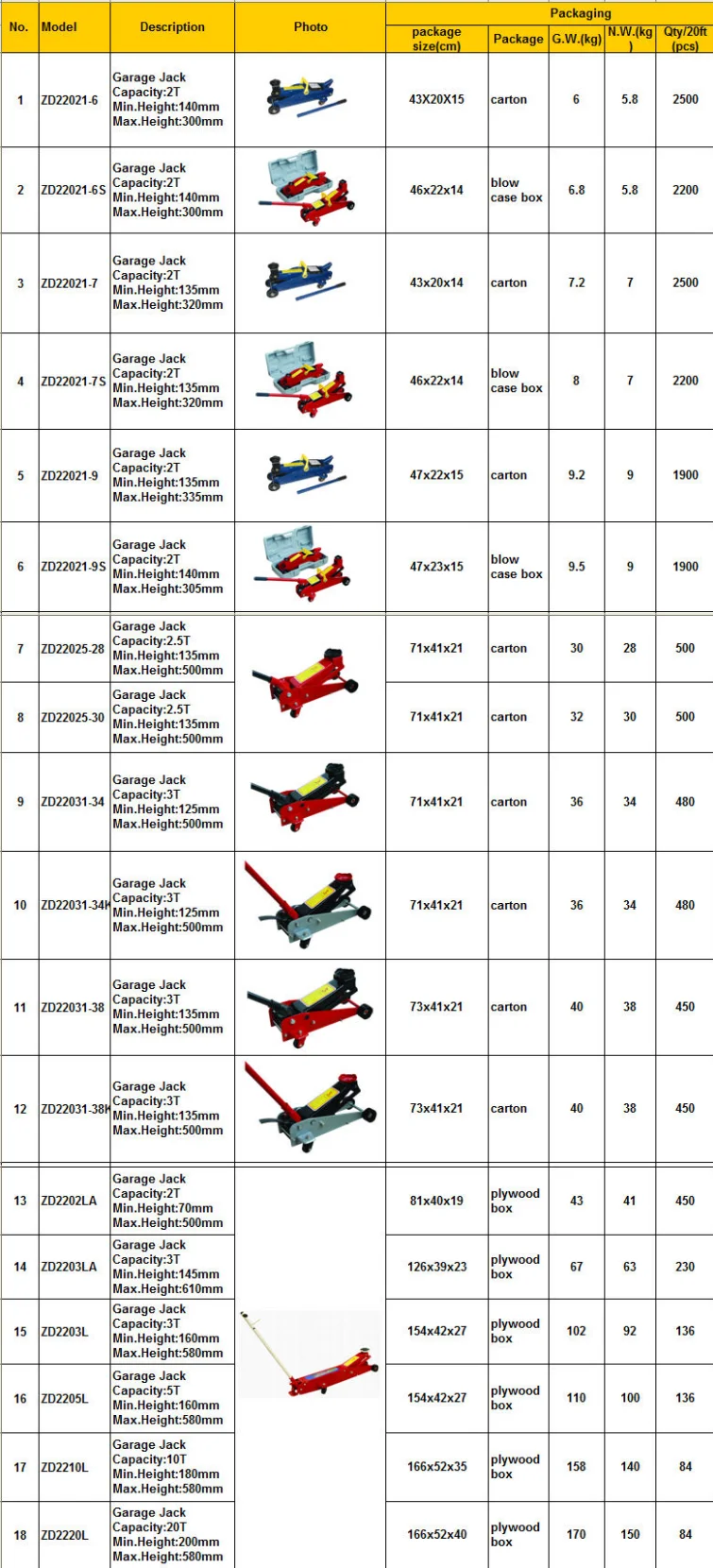 | Model Number | Capacity (ton) | Min.Height (mm) | Max,Height (mm) | G.W./N.W. (kg) | Package Size (cm) | QTY/20'CY (pcs) |