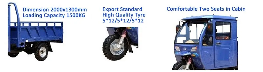 Majority products are motorized gas tricycle with displacement 110cc, 125cc, 150cc, 175cc, 200cc, 250cc, 300cc. The tricycle can load cargo weighting from 500kg up to 1500kg.
