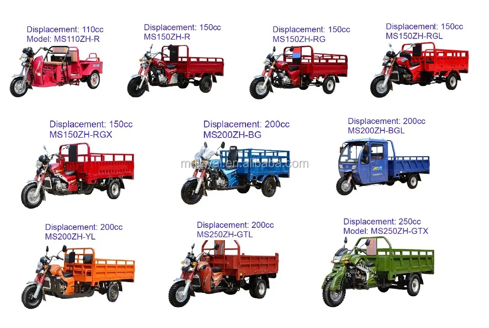 A: Our motorized gas tricycle displacement has 110cc, 125cc, 150cc, 175cc, 200cc, 250cc, and 300cc.