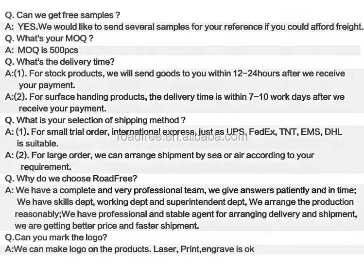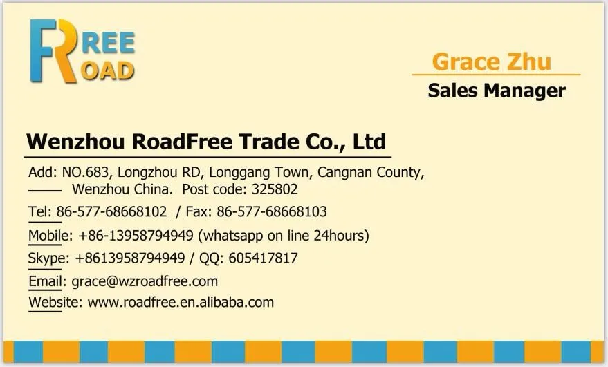 Wenzhou Roadfree Import&Export Co.,Ltd is a professional suppllier of road safety products, we are engaged in producing and selling , we have production dept, market research&purchase dept, engineering dept and sale dept. Products are sold to worldwide. our main products are road studs,road marking machines, thermoplastic paint, glass beads, traffic lights, road signs, convex mirror, reflective sheeting, etc.