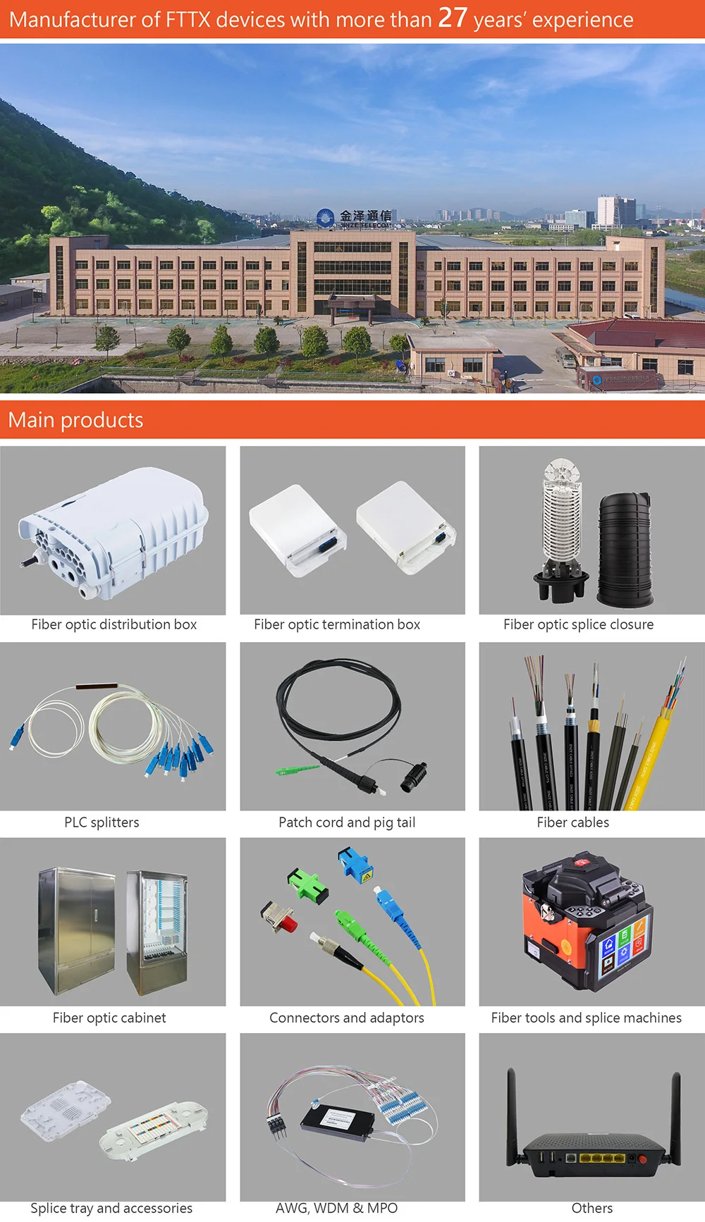 The equipment is used as a termination point for the feeder cable to connect with drop cable in FTTx communication network system. The fiber splicing, splitting, distribution can be done in this box, and meanwhile it provides solid protection and management for the FTTx network building.