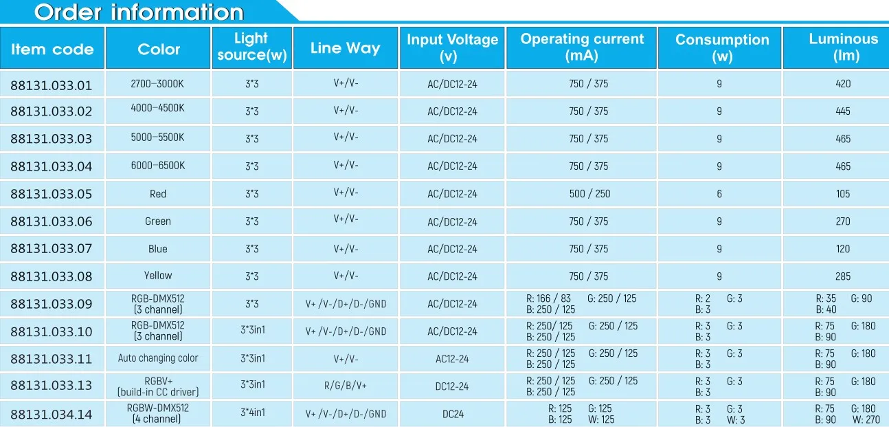 LED Q’ty: | 3pcs 3W LED / 3pcs 3in1 LED / 3pcs 4in1 LED | ||||||