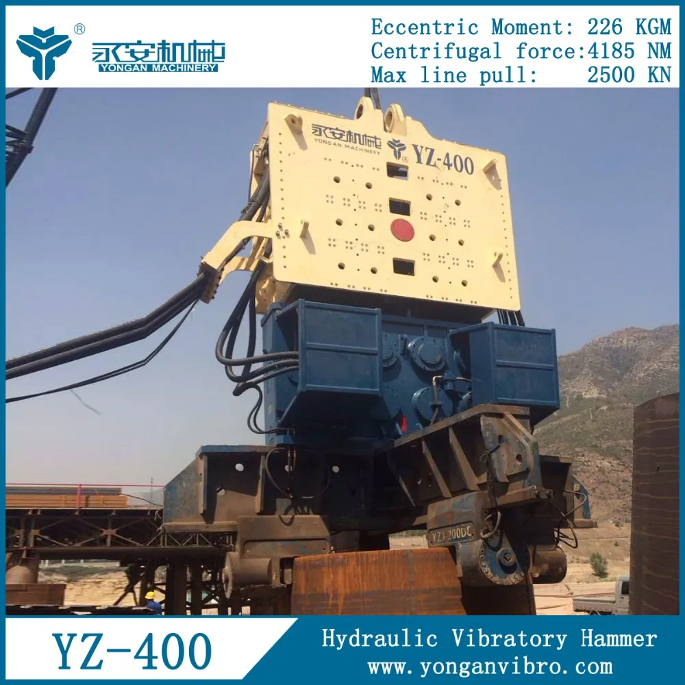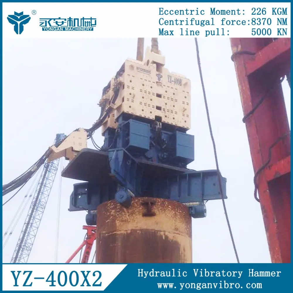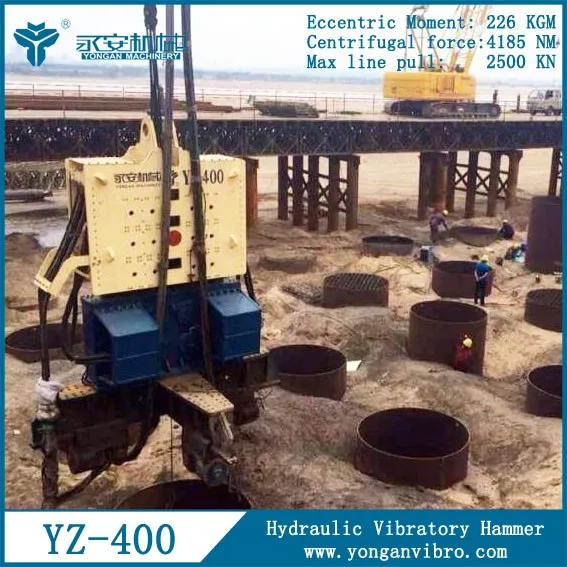 Piling hammers YZ400 is used to drive sheet pile to build the coffer wall. It is high efficiency to drive and pull sheet piles.