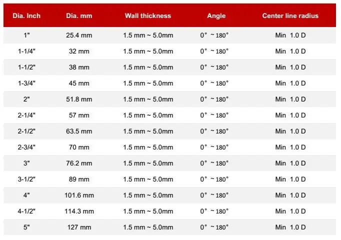 Process | Cutting | Mandrel bending | Beaded ends | Available | |||