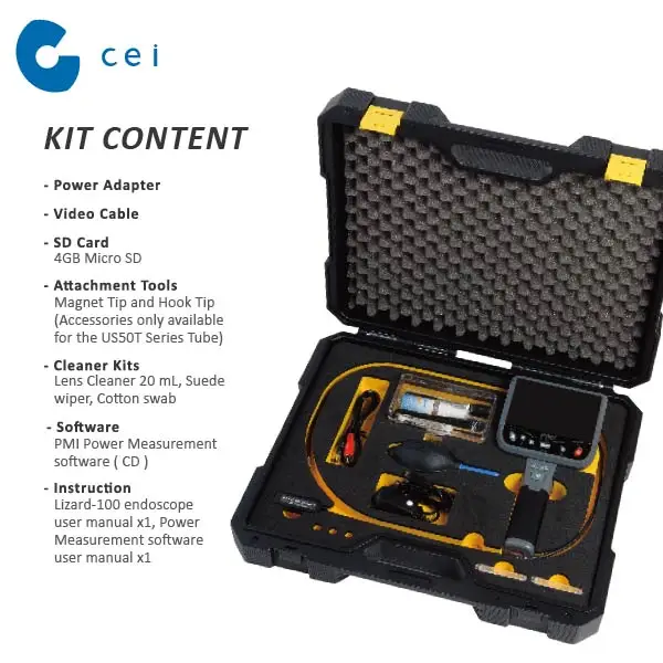 The Lizard-100 series are compact portable borescopes that allow users to execute inspection in restricted spaces which could not be directly observed with naked eyes. The PMI Lizard-100 series set includes a portable device, a camera tube, a cleaning kit, a power adapter, a video connector, and a 4GB SD card. The portable device with 4.8” TFT LCD screen is capable of viewing, capturing and reviewing photos and video images. Images can also be displayed directly on a TV screen. The portable device is powered by rechargeable Li-Ion battery and a universal charger is included.