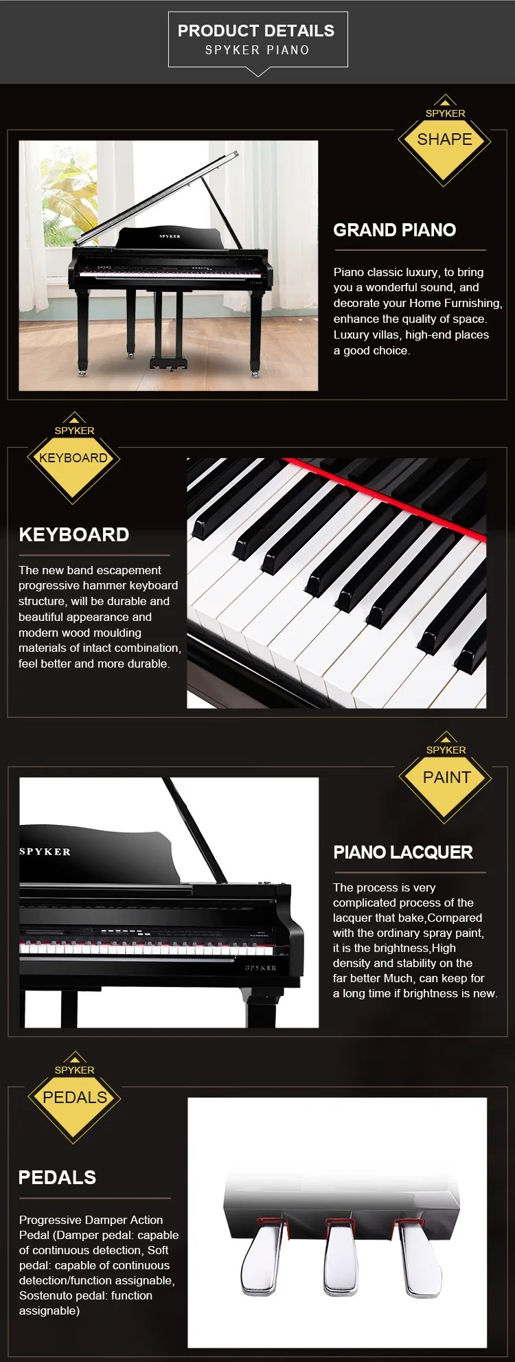 The surface of SPYKER piano is treated with complicated piano baking lacquer technique. Sand the surface of wood many times before repaint it repeatedly with base paint, and rub it with water sand paper and cloth, then polish it with paint every time before baking it with high temperature to enhance its solid color.