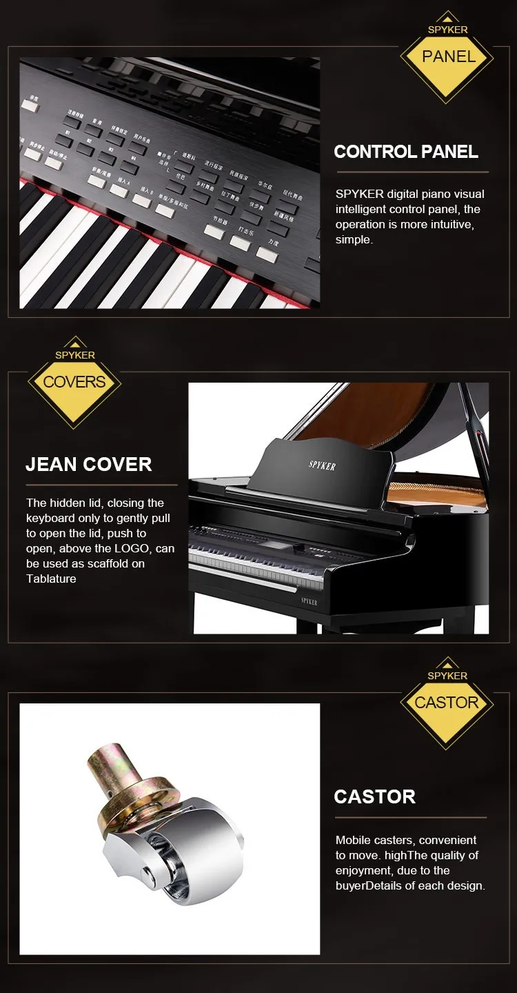 We are manufacturer of digital piano since 2006. We strictly concentrate on quality, surface treatment and tune.The material is heat resistance, waterproof . The chip is imported USA semi-conduct advanced chip.Our products exported to worldwide, it passed CE certification. PWM technology of multi-layer density makes high-fidelity timbre.