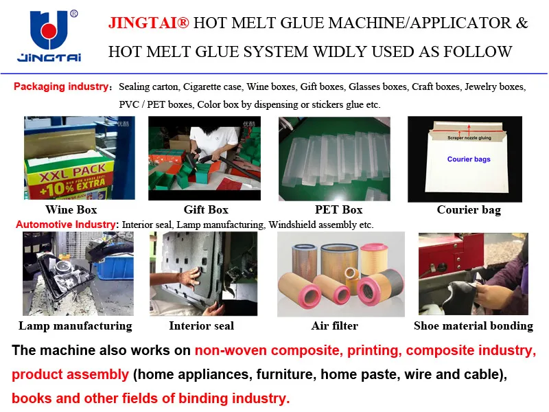 The Jingtai Equipment Co., Ltd. mainly suppply the hot melt glue machine/equipment directly, our machine also can do as one part of your whole produce process when you need the glue process.