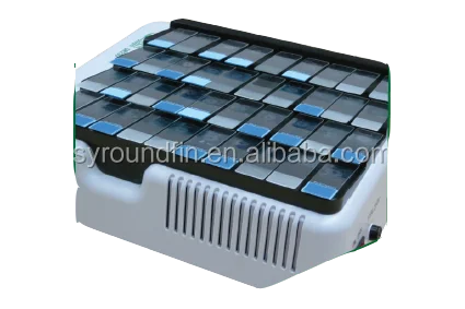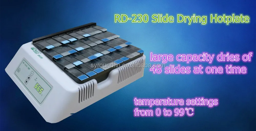 Drying hotplate with large capacity dries a maximum of 48 slides at one time.
