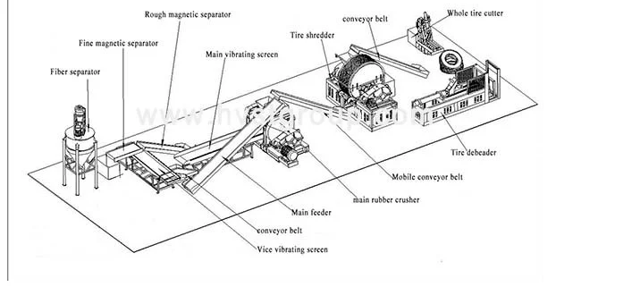 Waste tire - Tire de beader- whole tire cutting - tire shredder - Rubber crushing - magnetic separator - fiber separator - Rubber powder