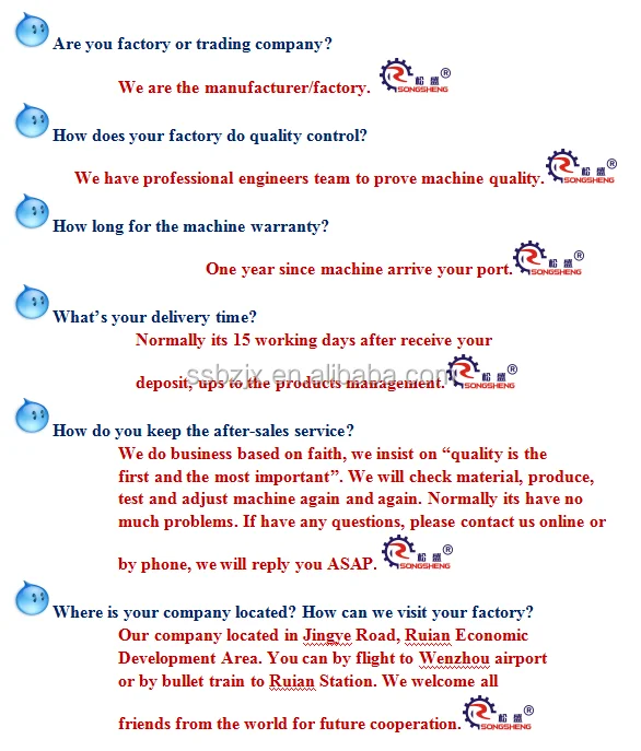 Ruian Songsheng Machinery Co., Ltd is located in China's plastic machinery production base- Ruian city. Company specialized in manufacturing film blowing machine, plastic bag machines and other equiped machines in one line for more than 10 years. We strive for quality and innovation in machine. We export the machines to worldwide as Southeast Asia, the Middle East, South Asia, Russian, North Asia, North America, Eastern Europe, Africa etc. Most welcome from all country to visit our company.