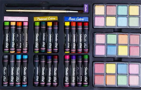 The set comprises 24 color pencils, 24 watercolor cakes, 24 oil pastels, 2 sketching pen, 2 pencils, 1 pencil sharpener, gauze paper, eraser, and 1 wooden case.