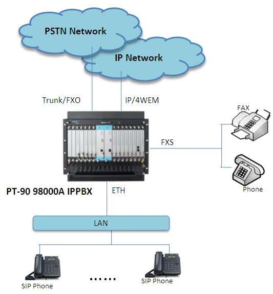 P98000A is a new generation of IPPBX multimedia exchange platform. With the state-of-the-art technology, it integrated the modernized IP SIP phone network with all the traditional PBX functionality in one single platform. A composite of network controller, soft switch, media gateway and signaling gateway all together with ISDN/PRI, E&M trunking and tandem exchange. It adopts embedded technology and modular design, complied with ITU-T recommendation and large scale, low powered FPGA. It supports different kind of analogue and digital voice signaling conversion inherently.