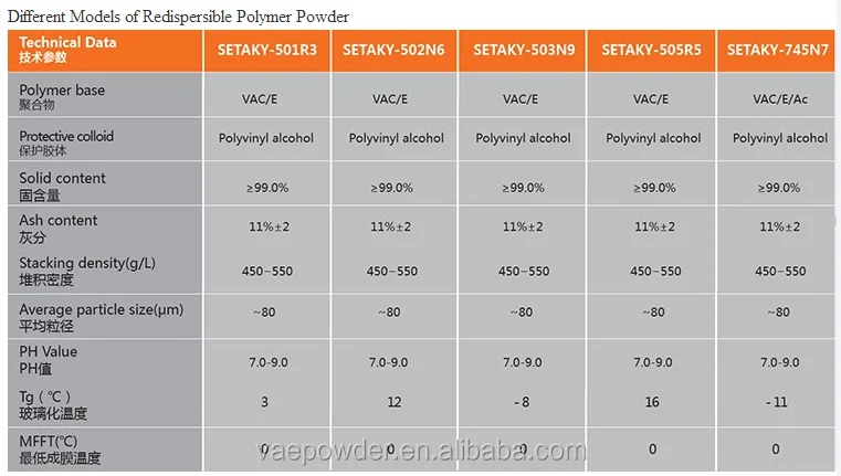 SETAKY® 503N9 is a redispersible polymer powder produced by spray-drying special water-based emulsion, mostly based on vinyl acetate and ethylene. It dissolves in water easily and quickly forms emulsion.