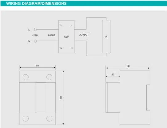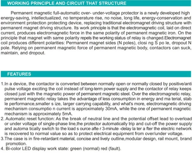 range of products, it will automatically cut off so as to protect the safely of electrical equipment and persons. The device will re-supply in 1 minute, when the power returns to normal.The green indicator display, when the power is normal supply.The red indicator display, when the power over voltage or under voltage. Installing: 35mm Din rail.