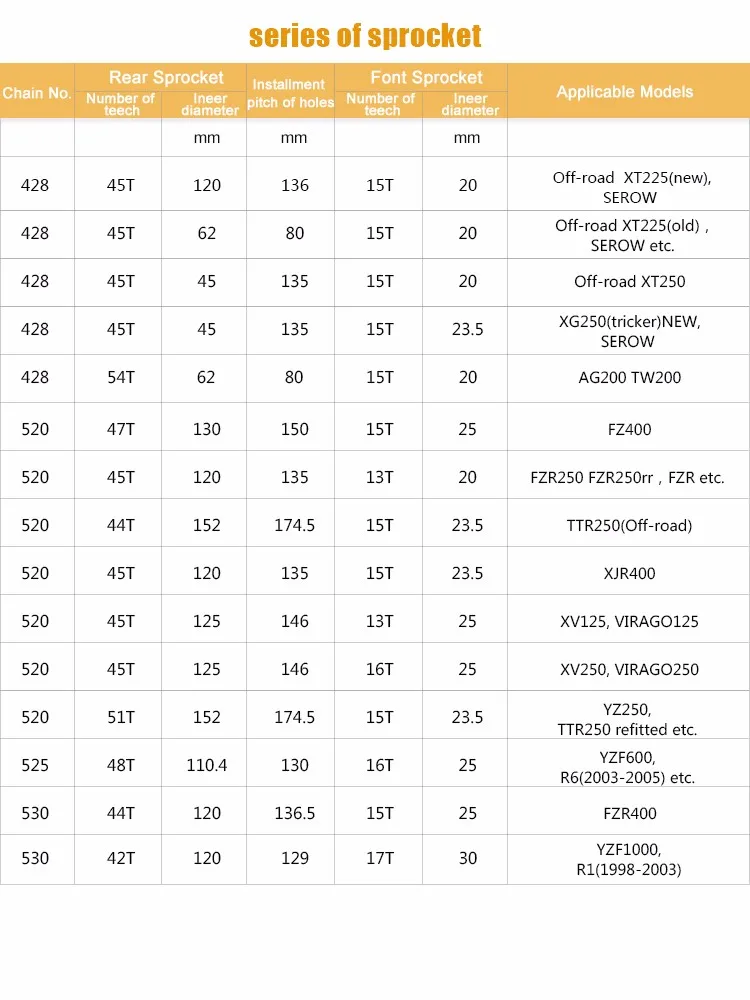 We can supply all kinds of motorcycle parts: motorcycle oil filter ,motorcycle brake parts ,motorcycle tire ,sprockets, O-ring chains, brake cables, helmets and sintered brake pads,etc , our factory offers all our customers’ a large parts and accessories for off-road vehicle, dirt bike, Harley and ATV. The bands of motorcycles include Honda, Yamaha, Suzuki, Kawasaki and etc.