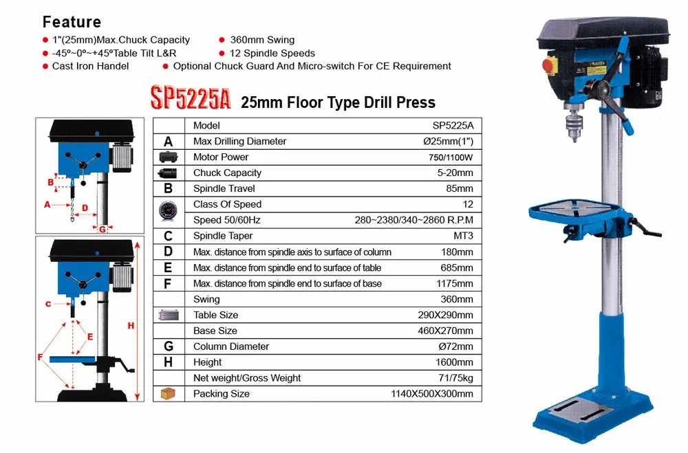 SP5225A Mini machine drill press belongs to one of our most Mini machine drill press. It is new condition not used Mini machine drill press. And it is medium in size and delicate in design. This medium size machine drill press is made in China, but have the similar quality with German drill press. The main features are as below: