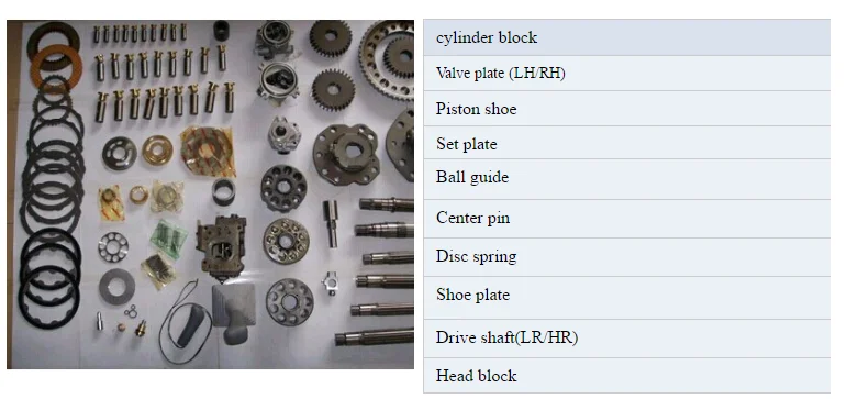 Hydraulic pump, Hydraulic spare parts, Travel motor, Swing motor, Travel gearbox, Swing gearbox, Main control valve, Hydraulic cylinder assy, Gear pump, Hydraulic motor, Swivel/Center Joint, Conversion kit, etc.