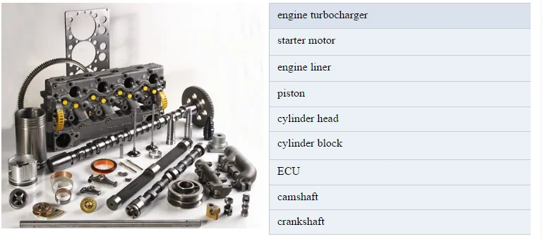 Cylinder block, Cylinder head, Crankshaft, Camshaft, Connecting rod, Engine assy, Injector, Fuel injection pump, Oil pump, Feed pump, Oil cooler, Filter, Turbo charger, Starter, Alternator, Water pump, Fan blade, Liner kits, Bearings, Valves, Gasket kit, etc.