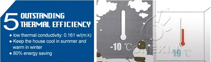 Thermal conductivity for Onekin green precast wall panel is 0.17w/mk,while cement panel is 0.66w/mk. According to a Korean customer test, for the house built by green panel, electricity consumption is about 2 kWh per day, while for cement panel house, it is about 10 kWh per day, which means our green wall panel can save up to 80% energy.
