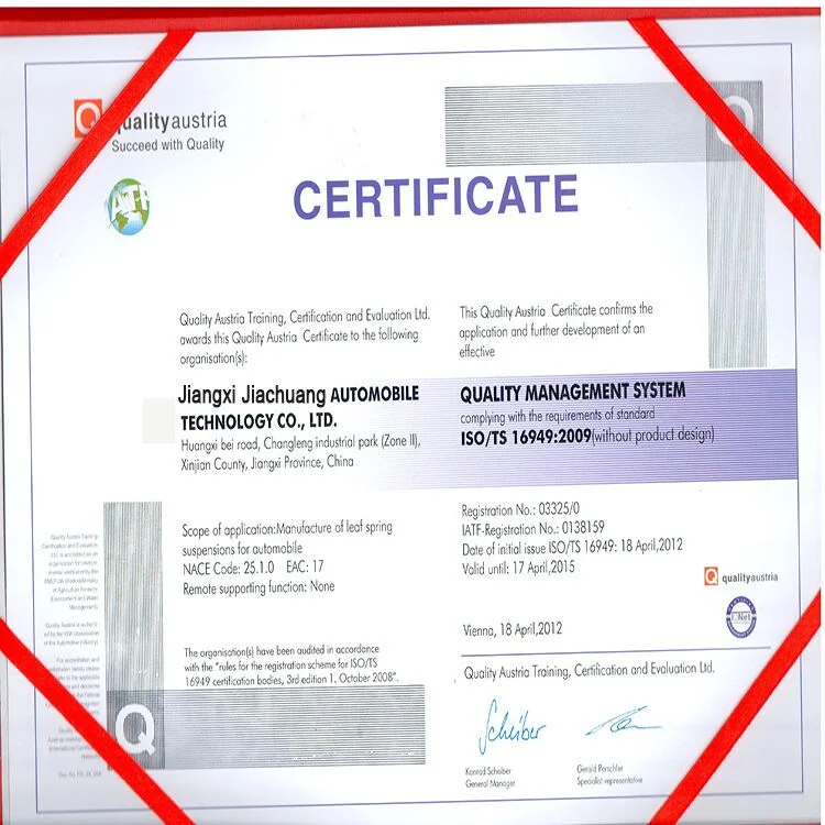 Jiangxi Jiachuang Automobile Technology Co., Ltd., have three factories, they are located in Jiangxi and Zhejiang, Specializing in producing LEAF SPRING, AIR SUSPENSION , MECHANICAL SUSPENSION, AIR BAG, TRAILER, COIL SPRING, LANDING GEAR, SPRING BIN, BUSHING and UBOLT, TIRE BOLT. All of them have passed ISO/TS16949 international standards.