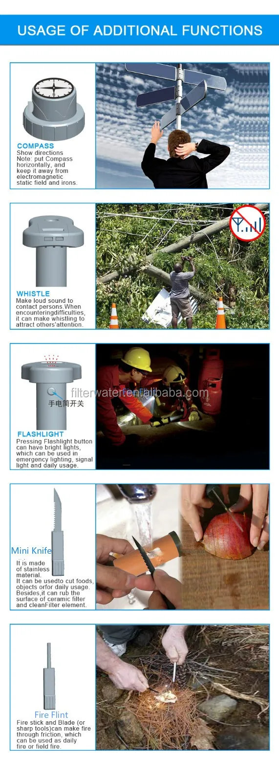 Additional Emergency Features integrated in the filter – Compass, Whistle, Flashlight, Mini-Knife and Fire Flint, perfect for camping, hiking, backpacking, explorations, fishing and all outdoor adventures.