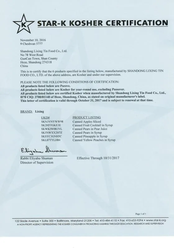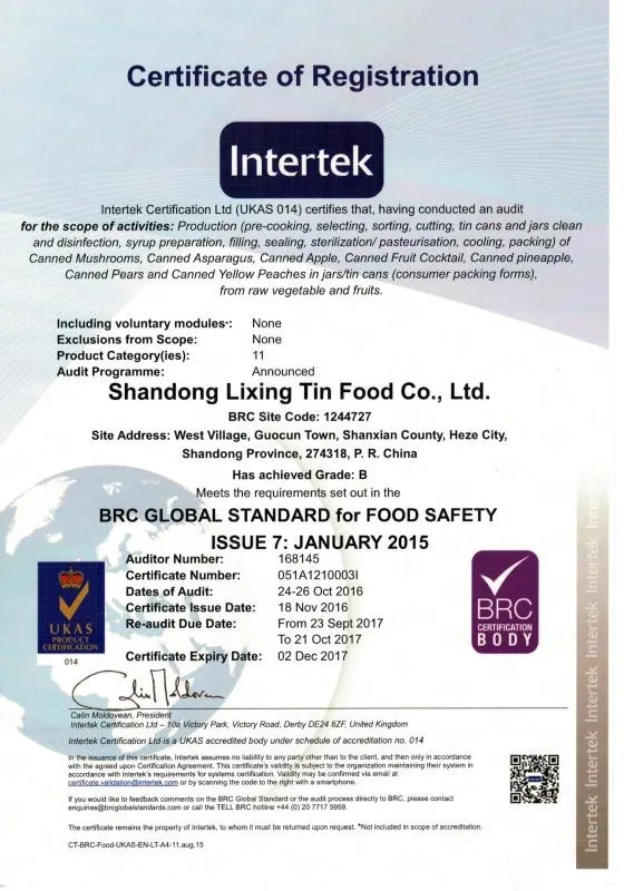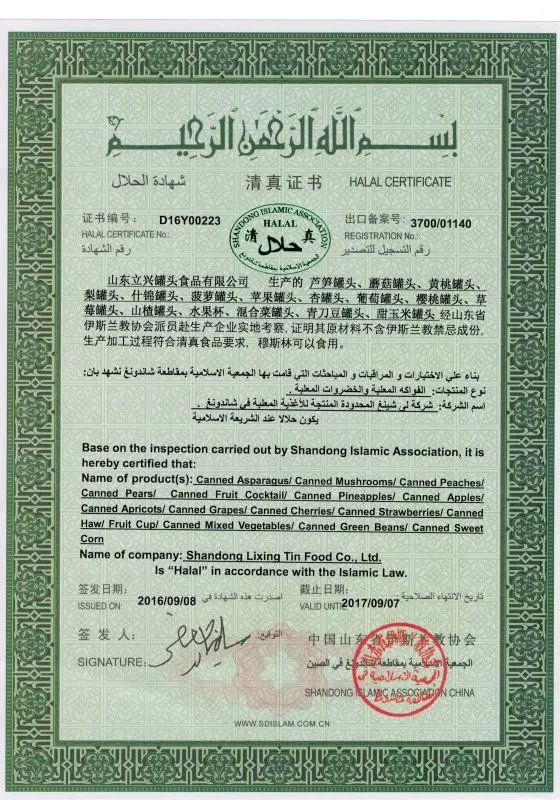 Shandong Lixing Tin Food Co., Ltd was established in Oct, 2003. The main products are asparagus, yellow peaches, canned pear, canned fruit cocktail, canned mushroom, etc. The annual output of more than 10,000 tons. All product have been export to the EU, Canada, USA, Middle East, South Asia I and other regions.