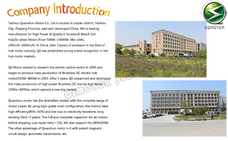 QS MOTOR is the MANUFACTURER of high quality & power Electric Bike/Scooter/Car Hub in-wheel motor (CE approved) with competitive price for 10 years! Ranging 500W-14kW, 48-144V, 30-160KPH, with the customers of Mahindra GenZe in USA/India, Govecs in Germany, Terra Motors in Japan.