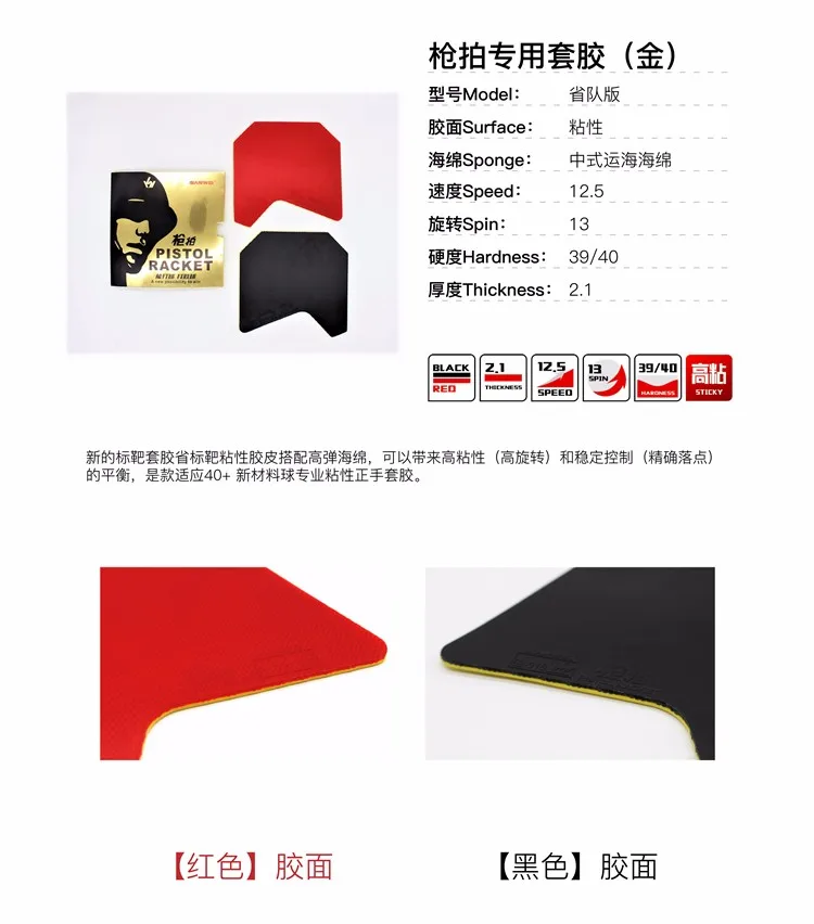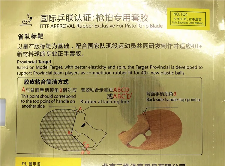 As the upgraded version of PISTOL RACKET, the TQ3/TQ4 is a better choice for 40+ new plastic ball. Thanks to the advanced production technique, covering the unsmooth topsheet with ultrathin sticky rubber film, which helps to keep both high elastic performance and good spin effect; combining with cake sponge, offering sustained and strong power.