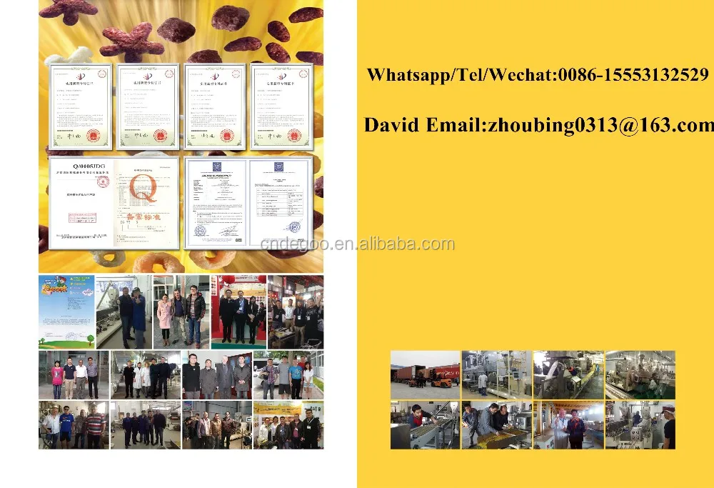 Our extrusion puffed systems are widely applied in: Puffed Snack Pellet(Tortilla chips/Dorito chips/Bugles) Food, Breakfast Cereals and Corn Flakes, Vegetable Protein Food(textured/fibre soya protein), Nutritional and Artificial Rice, Nutritional Cereal Power, Modified Starch, Bread Crumbs, Pet Food, Aquatic Feed and other food.