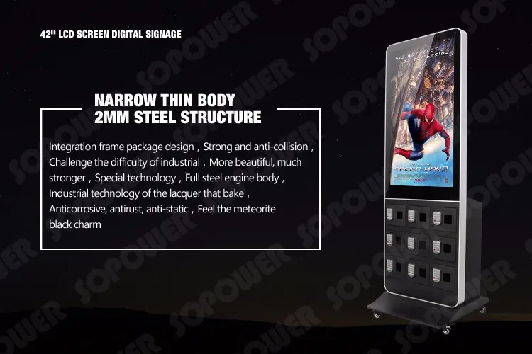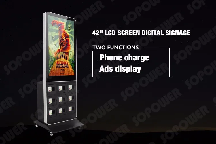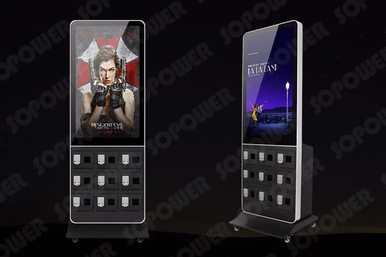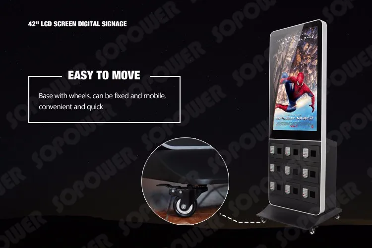 Sopower network advertising cell phone charging station is an innovative product that integrates digital locker, phone charger and advertising display as "three-in-one",so that people can have their cell phone charged and locked for anti-theft, they can either stay there watching advertising video or walk away to buy a Newspaper, coffee or hamburger. This Phone Charging Machine With remote control/touch screen also can be used as an display lcd, , it mainly targeted for self-service cell phone charge in unsupervised or semi-supervised positions. such as tourism, health care, hospitals, restaurants, financial services, shopping malls, universities, airports, gas stations, railway stations and other public areas.
