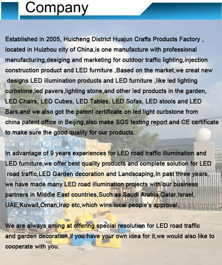 2. Q: How many kinds of products in your factory ? A: we have a large range of products, led table, led chair/stool/sofa, ice bucket, led lamp, bar counter, flower pot, other decors,..